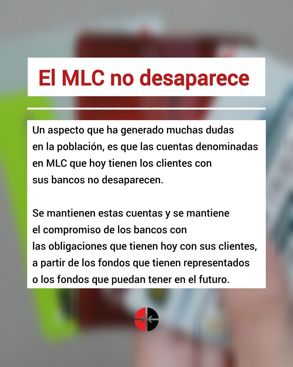 “Un aspecto en el que quisiera ser lo más conciso y preciso posible, y que ha generado muchas dudas en la población, es que las cuentas denominadas en MLC que hoy tienen los clientes en los bancos no desaparecen. Se mantienen esas cuentas denominadas en MLC y el compromiso de los bancos en las obligaciones con sus clientes, a partir de los fondos que tienen representados o los fondos que puedan tener en el futuro.