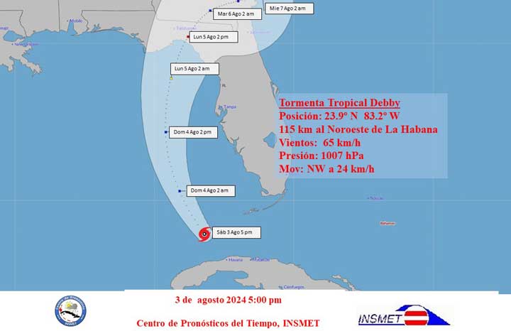 A las cinco de la tarde el centro de esta tormenta tropical se localizó en 23.9 grados de latitud norte y 83.2 grados de longitud oeste, posición que lo sitúa a 115 kilómetros al noroeste de La Habana. Se desplaza al noroeste a 24 kilómetros por hora.