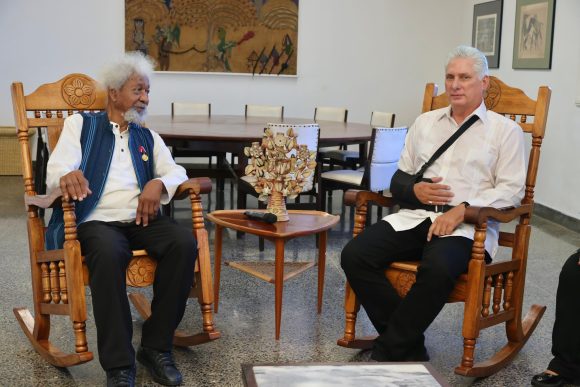El mandatario apareció con el cabestrillo en un acto en homenaje al escritor nigeriano Wole Soyinka, premio Nobel de Literatura en 1986, de visita en La Habana.