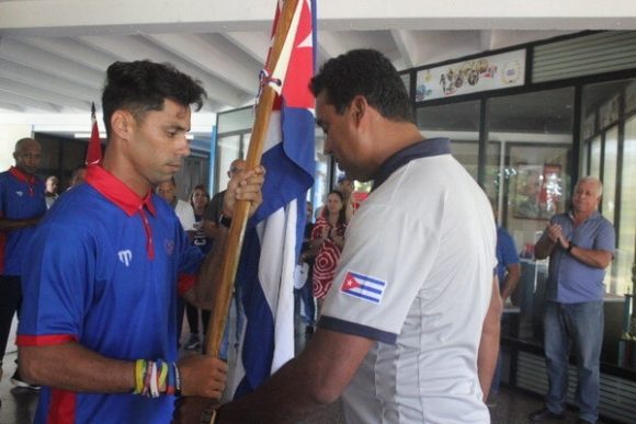 Fornés entregó la enseña patria, que había recibido de la leyenda del beisbol cubano Pedro Medina, al mediocampista habanero Briandy Molina, capitán de la escuadra, quien estuvo escoltado por los también monarcas de la edición precedente Orlando Amador y Lietis Arcia.