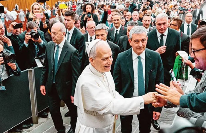 El Papa León XIV recorrió el pasillo central para estrechar la mano de numerosos periodistas, seguido por centenares de cámaras: una salida tan impactante como su entrada apenas media hora antes.
