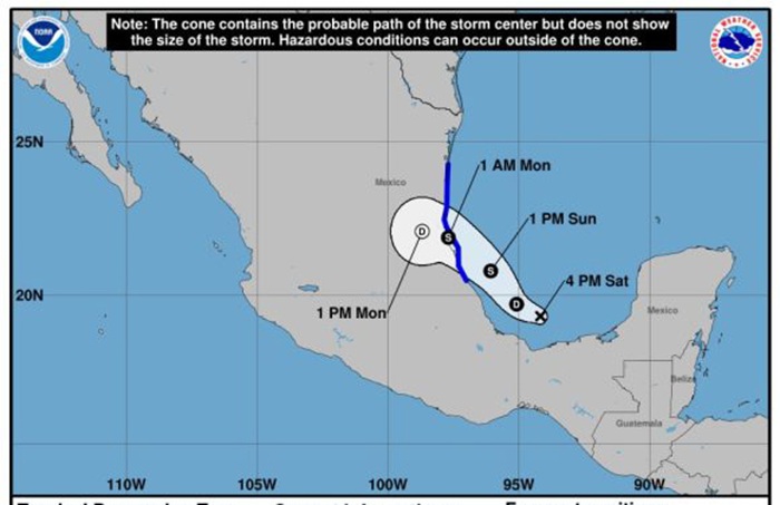 Añade que a las cinco de la tarde la región central de este sistema se ubicó en los 19.3 grados de latitud Norte y los 94.2 grados de longitud Oeste, a unos 385 kilómetros al este-sudeste de Tuxpan, México.